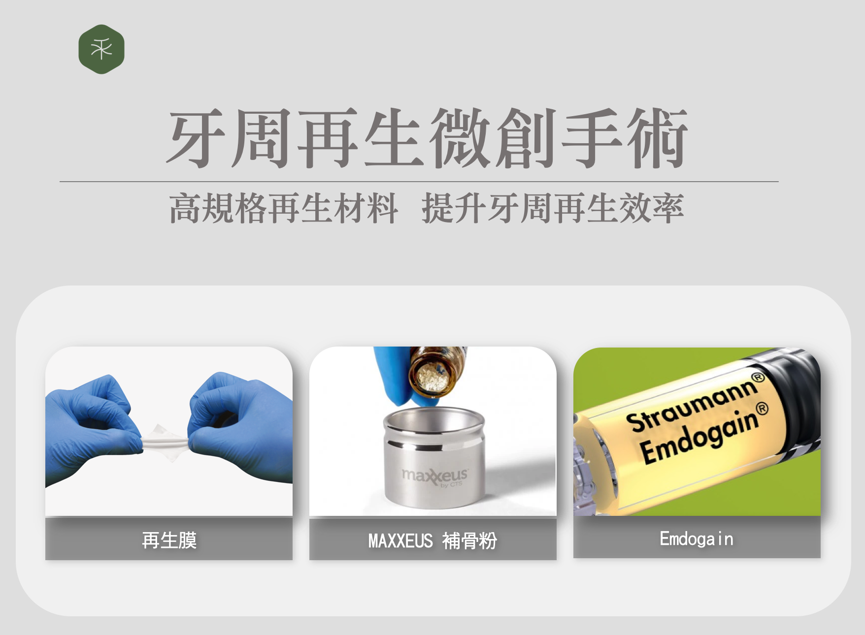 來自瑞典的生物科技,可被用來促進牙周組織的再生。 Emdogain 可以促進牙周組織的癒合,減少發炎反應,並刺激血管生成和組織再生。其主要成分是一種名叫牙釉質形成素(Amelogenin)的蛋白,它的功能包括了:促進成骨細胞、牙骨質細胞的生長及分化,還能刺激血管新生,有利於傷口癒合,及有效降低術後的感染與不適。